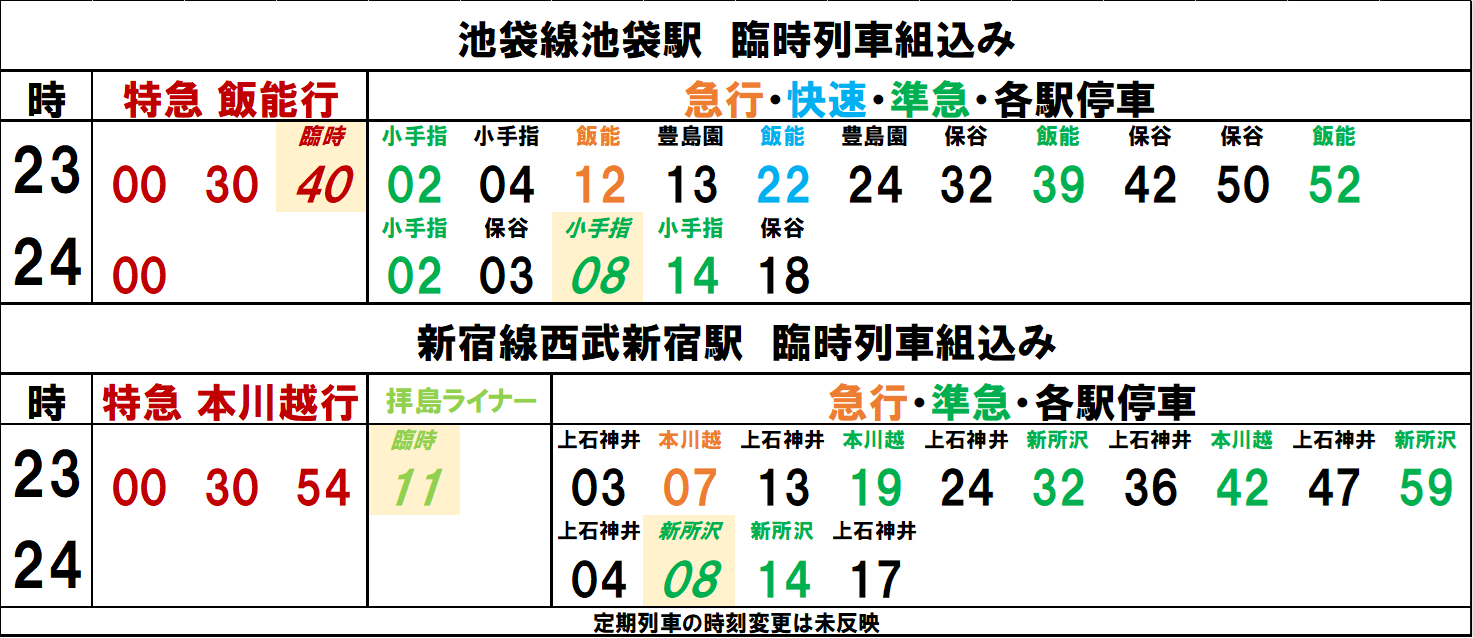 池袋線:特急飯能行(23:46発)、準急小手指行(24:05発、24:42発)