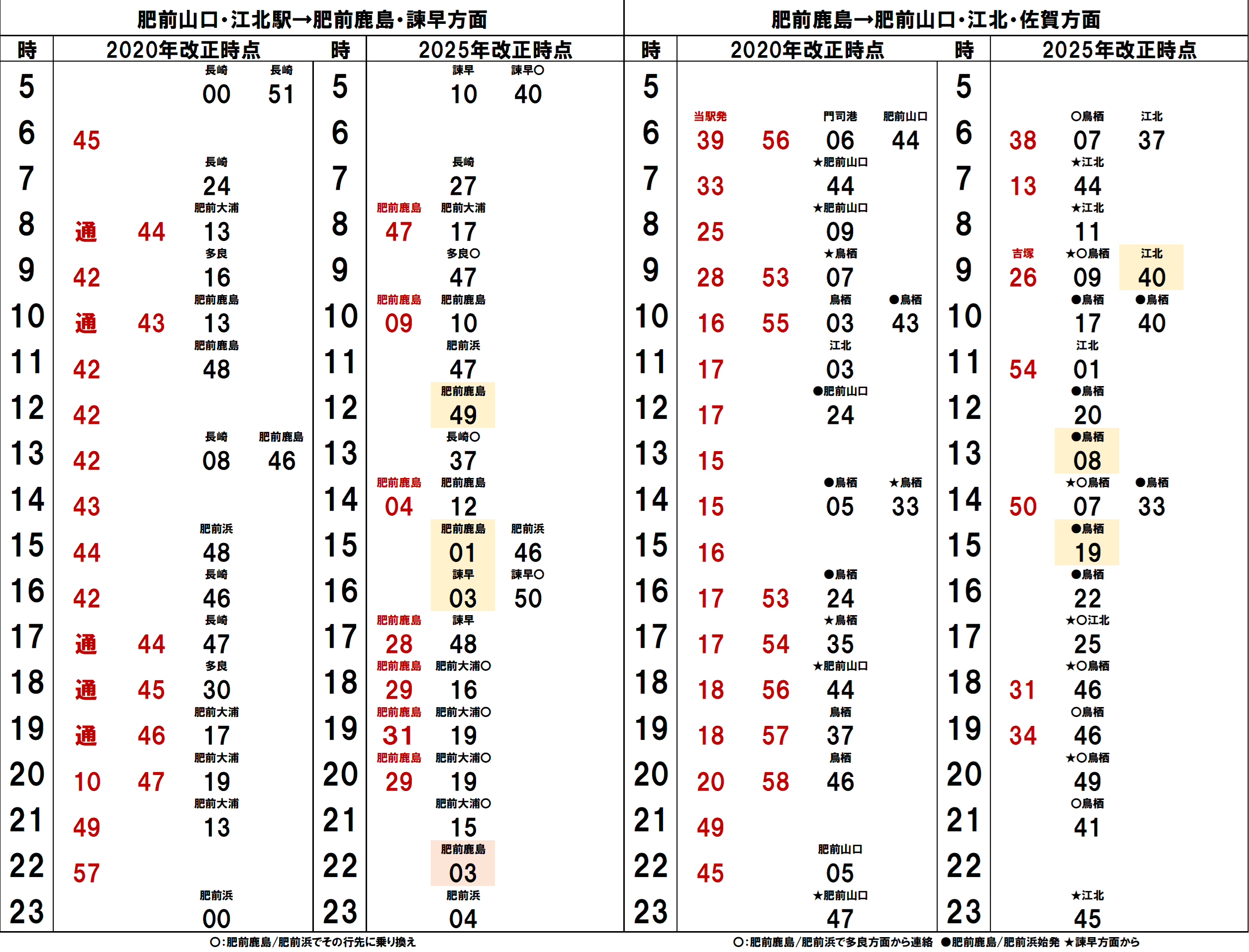 肥前山口(江北)と、肥前鹿島両駅の時刻表を作成した。2020年時点と2025年時点を比較している。これは手元に時刻表がなかっただけであるから、ご容赦いただきたい。ここで注意しておきたいのは、肥前鹿島駅は在来線特急「みどり」について、肥前山口通過便含め、全列車が停車していたことと、肥前山口~長崎間の特急停車駅は、肥前鹿島のほか、諫早、浦上、長崎のみであったことである。