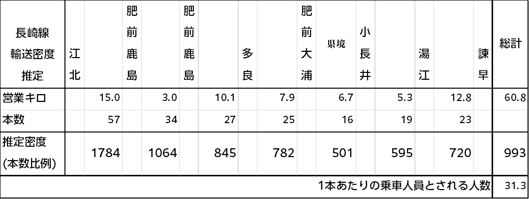もっとも、NHKニュース等報道をみれば、かささぎの1人当たりの利用者数は300人程度、すなわち、1列車20人強となっており、6ないし、8両編成で運転するのはおよそ不採算であることは明らかである。とはいえ、江北~諫早間の輸送密度(約900人)と、営業キロ(江北~肥前鹿島がその1/4程度)、運転本数(肥前鹿島~肥前大浦~湯江~諫早間に比べて倍以上)などから察するに、相当量の輸送需要がある路線であることには変わりない(おおよそ2000人程度か)から、普通電車での代替を進めてそれで手打ちということになるかもしれない。