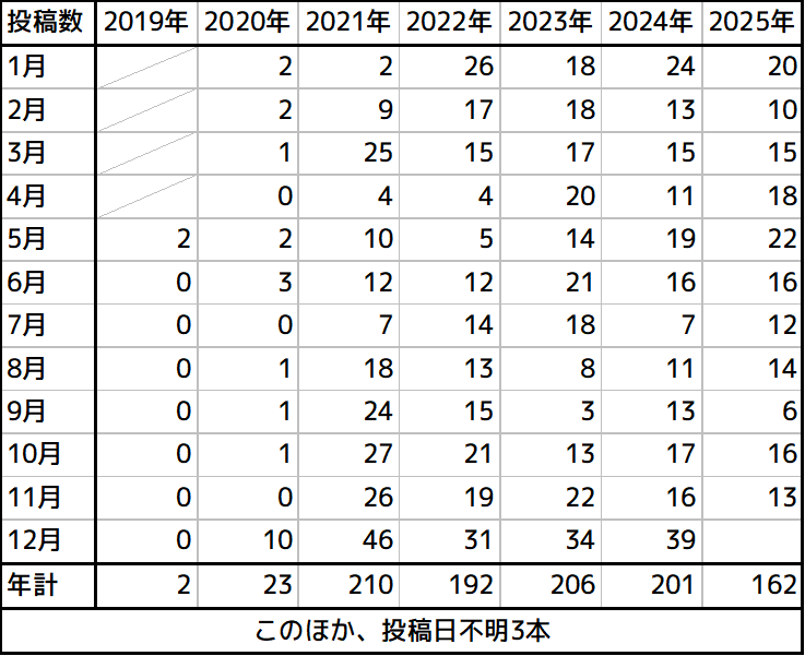 さて、ここまでの投稿本数をおさらいしてみますと、以下の通りとなります。