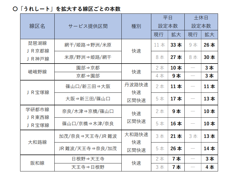 ・大和路線加茂、奈良駅から大阪環状線に直通する区間快速について、天王寺から大阪環状線内まで設定となる。