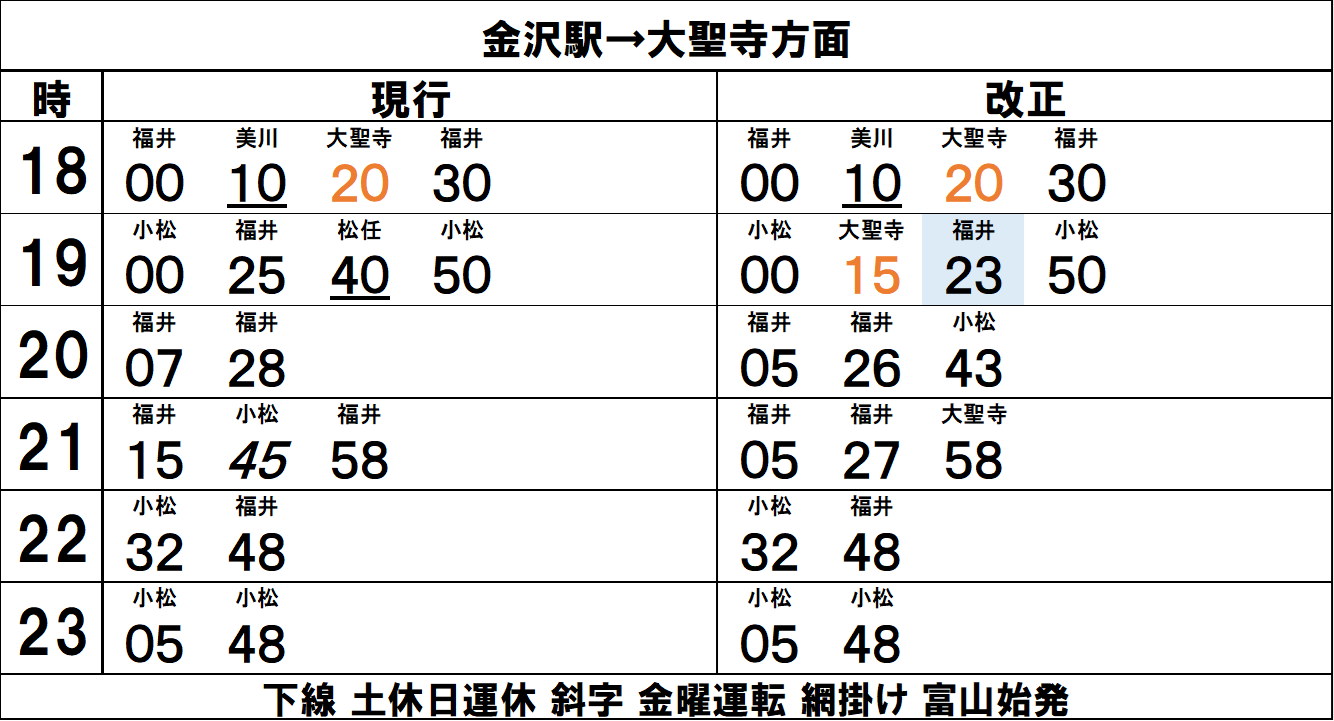富山駅9時42分発金沢行き、金沢11時05分発富山行きは、GW、お盆などの多客期(50日)に521系2連から521系4連に増結していた。今回のダイヤ改正から、更に土休日(合計120日)でも増結となった。もっとも、車両は413系3連に変更されるが、2027年春ダイヤ改正からは521系3連(あいの風独自開発の中間車の入った編成)に変更される。