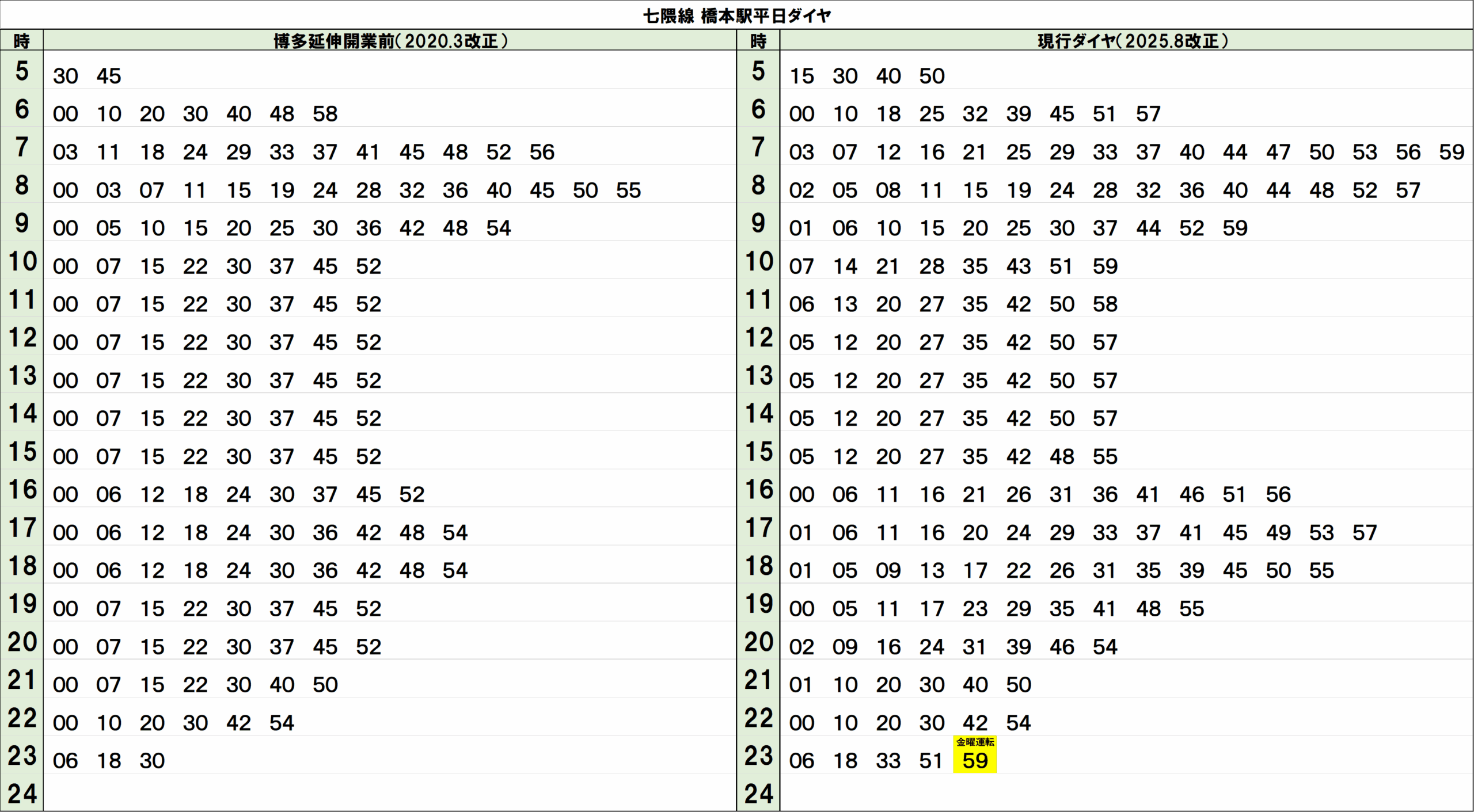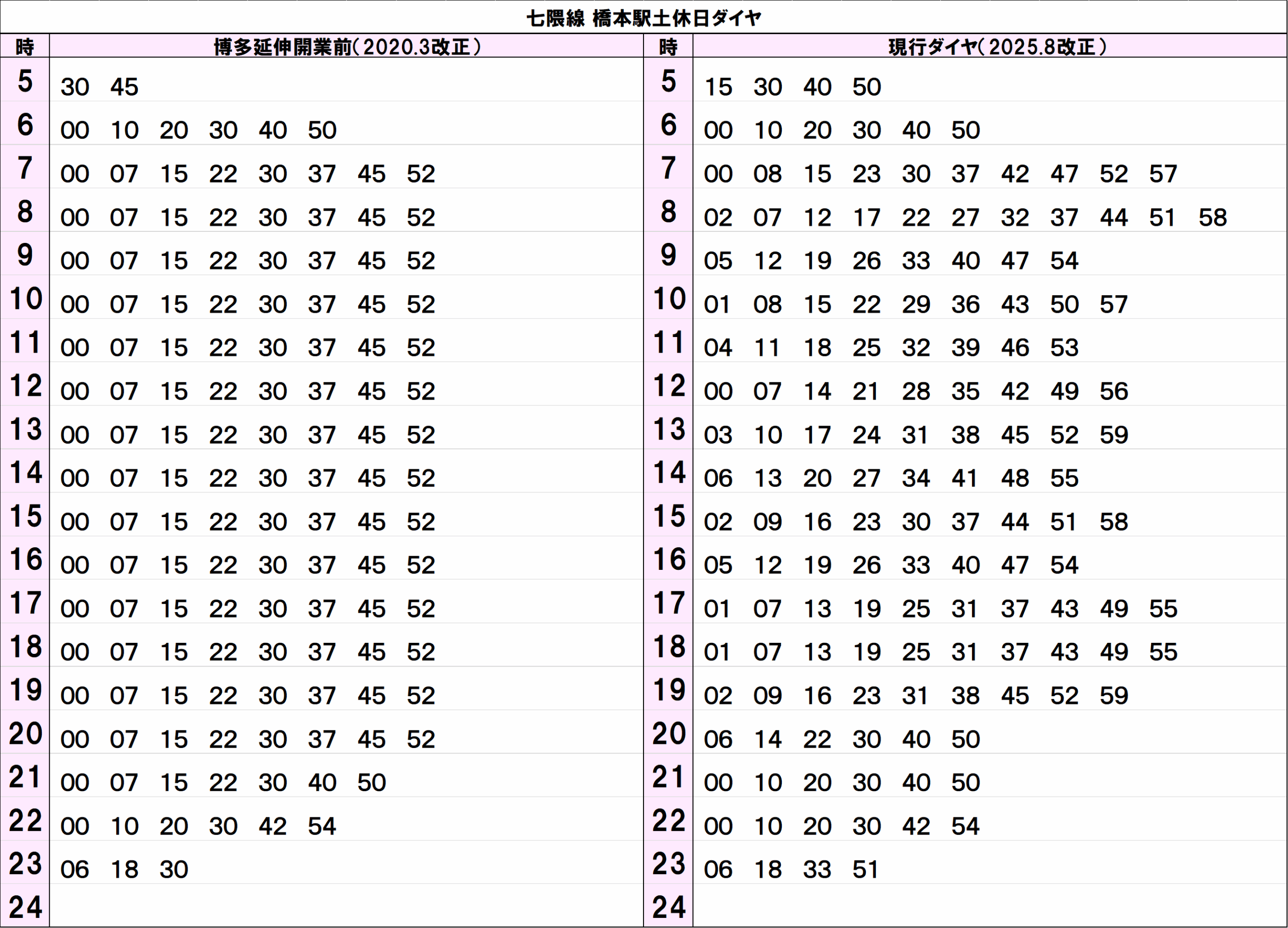 2020年3月改正時刻:https://warp.ndl.go.jp/info:ndljp/pid/11509698/subway.city.fukuoka.lg.jp/pdf/daiya/hashimoto.pdf